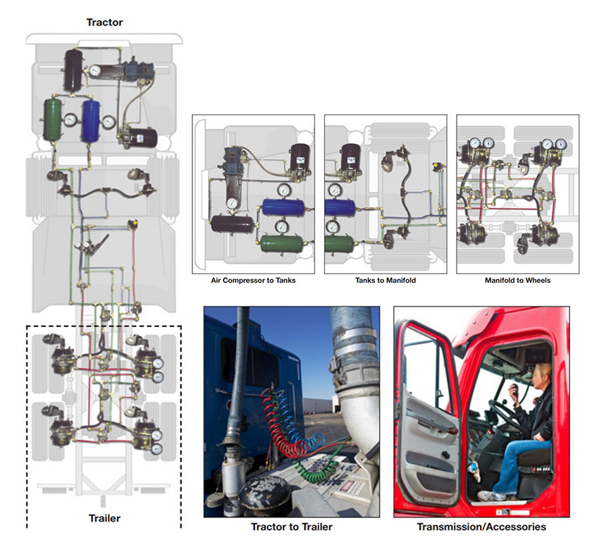 에어 브레이크 시스템에 사용되는 공기는 엔진 실에 위치한 벨트 구동 압축기에 의해 생성됩니다. 에어 브레이크는 엔진이 작동하는지 여부에 관계없이 작동해야하므로 일정한 공기가 필요할 때 사용할 수 있어야합니다. 에어 브레이크 시스템은 서비스와 비상의 두 가지 하위 시스템으로 나뉩니다. 서비스 시스템은 차량이 작동 중일 때 사용됩니다. 비상 시스템은 차량이 주차 될 때 또는 서비스 시스템이 실패 할 때 사용됩니다. 결과적으로, 압축기의 공기는 일련의 탱크에 저장되며 탱크의 압력이 지정된 수준으로 떨어질 때 압축기에 의해 보충됩니다.